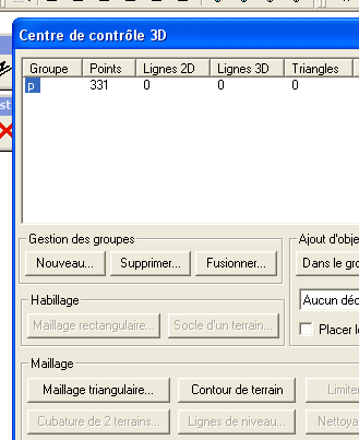 • Le centre de contrôle affiche maintenant le nombre de triangles calculés. L'affichage du maillage n'est pas nécessaire pour la suite, Mais ici on va tout de même l'afficher : faîtes un clic droit sur le groupe et cliquez 'report des triangles'.