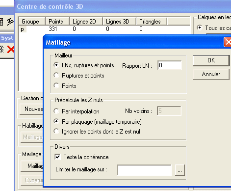 • Le centre de contrôle 3D apparaît : le dessin ne contenant que des éléments du même terrain (points 3D dans le calque 'P'), cliquez simplement sur 'Suivant calque'.