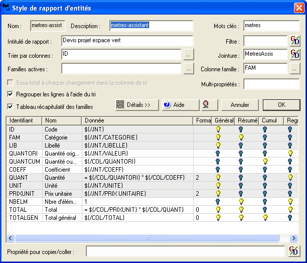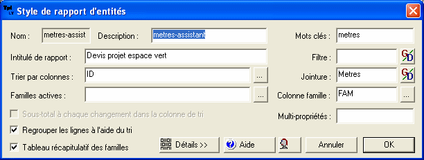 • Les métrés sont en fait des rapports d'entités. Pour le créer, menu SI Outils/Styliste et sélectionnez les rapports d'entités.