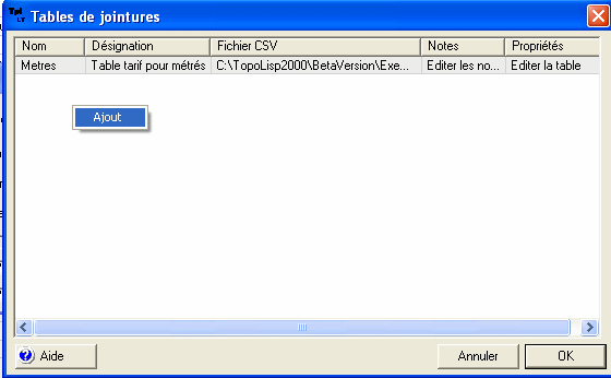 • Avec le menu contextuel (clic droit) ajouter une nouvelle table de jointure. Renseignez le nom, la désignation et le fichiers CSV (ici métrésveget300.csv du dossier exemple).