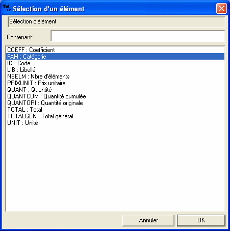 • Si vous souhaitez un tri sur une autre colonne que celle par défaut, utilisez le bouton « ... » à sa droite. De même si la colonne de regroupement des éléments de métrés (appelée aussi famille) change utilisez le bouton « ... ».