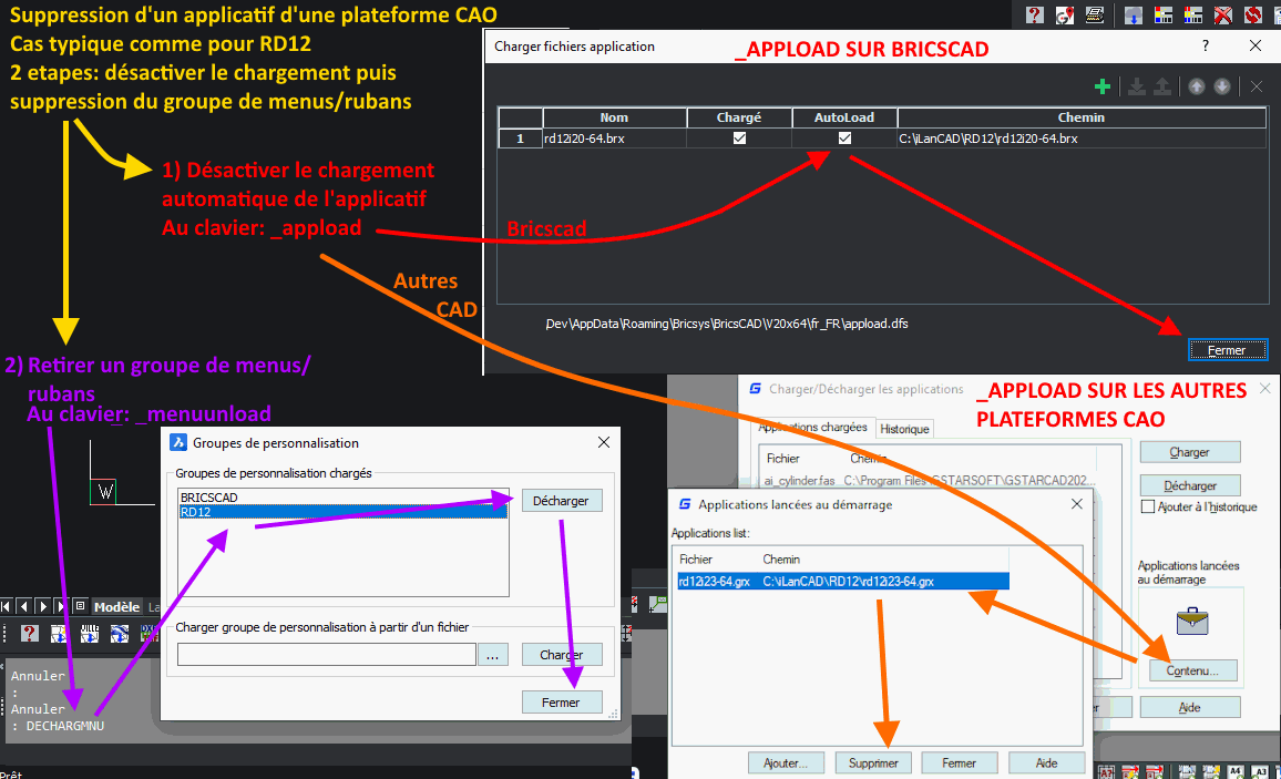 DESINSTALLATION RD12 Le déchargement des menus et la désactivation de l'applicatif sont à faire manuellement avec avec les commandes clavier _MENUUNLOAD et _APPLOAD comme indiqué sur l'image ci-dessous.